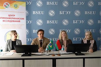 С приветственным словом выступили представители академического и дипломатического сообщества. Особую значимость мероприятию придало участие Чрезвычайного и Полномочного Посла Бразилии в Республике Беларусь Бернарда Жорга Леопольда Де Гарсия Клингла, а также директора Республиканского центра национальных культур. Их выступления подчеркнули важность укрепления культурных и экономических связей между Беларусью и странами Латинской Америки, а также роль академической среды в развитии международного сотрудничества. Проректор по учебной работе БГЭУ О.А.Морозевич поприветствовала участников мероприятия и отметила эффективность взаимодействия Посольства Бразилии с БГЭУ, в ходе которого появляются и реализуются интересные совместные проекты. Приятным сюрпризом для участников «Латиноамериканского вектора» было видеообращение с приветственным словом начальника отдела международного сотрудничества Университета Минас-Жерайс (Бразилия) Азиза Туффи Салиба и преподавателя португальского языка ФМБК А.С.Шилюк, которая обучается в Белу-Оризонти по гранту Посольства Бразилии.